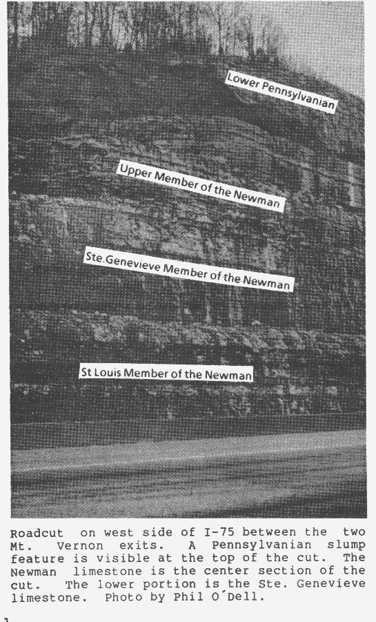 PHYSIOGRAPHY This caving area is formed at the intersection of two major physiographic divisions, the eastern edge of the Mississippian Plateau and the western edge of the Cumberland Plateau or Eastern Kentucky coal Field. The Mississippian Plateau is characterized by gently rolling hills and extensive areas of sinkhole plain. Outlines of the dissected Cumberland Plateau are also present. The Cumberland Plateau area is characterized by highly dissected rocks of Pennsylvanian and Mississippian age. Further east, the Mississippian strata are generally not exposed. The rugged terrain has very steep hillsides with approximately 500-550 feet of elevation change between the valley bottoms and the ridge tops. In some locations, as much as 200 feet of limestone in Rockcastle and 350 feet of limestone in Pulaski counties are exposed. GENERAL GEOLOGY Rocks chiefly of Middle and Upper Mississippian and Lower and Middle Pennsylvanian age comprise the area of Rockcastle, Jackson, and Pulaski counties of the Commonwealth of Kentucky. The Mississippian strata in these counties is comprised predominantly of limestone, with lesser amounts of sandstone and shale. The limestone averages 85-90% calcium carbonate in composition. The Mississippian rock units in the region covered by this report are as follows, named in ascending order. These start with the Borden Formation, whose uppermost member (unit of formation division) is the Renfro. It is a dolomite and is not recognized in the section of rocks southeast of Rockcastle (See Figure 1). In Rockcastle and Jackson counties, the Newman Limestone is the unit that overlies the Borden Formation. It is subdivided into three members, the St. Louis, Ste. Genevieve and the Upper Member. The Ste. Genevieve and the Upper members of the Newman are the chief cave forming rocks. Although cave passages do penetrate the St. Louis and even the Renfro Member of the Borden, there are no known entrance found in the Renfro. Above the Newman Limestone is the Pennington Formation, a shale with occasional limestone beds in its lower part. Above the Pennington are the Pennsylvanian rocks. On the west side of the Livingston topographic quadrangle the Livingston Conglomerate Member of the Lower Pennsylvanian Lee Formation cuts down through the Pennington and Newman. This is a paleo river channel which forms the sandstone cliffs in the area of Sinks of the Roundstone Cave. The remainder of the Lower Pennsylvanian Lee Formation overlies this channel, and where the channel is not present, the Pennington. East South-east of Mt. Vernon in. the vicinity of Pine Hill Cave the Lee Formation rests directly upon the Upper Member of the Newman Limestone, as the Pennington has been eroded away. Moving from Rockcastle County southwestward into Pulaski County, a different nomenclature is applied to the Middle and Upper Mississippian rocks. As shown in Figure 2, the Ft. Payne Formation correlates to the Borden of Rockcastle County; overlying the Ft Payne are the Salem and Warsaw Formations: These units are mapped as one in Kentucky. They do not correlate to the Renfro as they are younger rocks than the Uppermost Ft. Payne. These rocks are not present in Rockcastle and Jackson counties. Above the Salem and Warsaw is the St. Louis Limestone. The St. Louis carries formation status here as opposed to member status in the Newman limestones of Rockcastle County. Almost no caves are known in the Salem, Warsaw and St. Louis formations in this area as most or all of these units are below the pool level of Lake Cumberland. it is certain that cave passages exist in the St. Louis Limestone here, given the submerged lower levels of Sloan's Valley Cave system. The units overlying the St. Louis Limestone are the principle cave forming units in Pulaski County, constituting the Monteagle Limestone. The Monteagle correlates to the upper two members of the Newman Limestone in Rockcastle and Jackson counties, and itself is made up of two member units. Overlying the St. Louis is the lowermost of these two units, the Ste. Genevieve Member, equivalent to the Ste. Genevieve of the Newman. Above is the Kidder Limestone Member of the Monteagle. The St. Louis, Ste. Genevieve and Kidder members are much thicker than their equivalents in Rockcastle and Jackson counties due to a regional thickening of these rock units to the south. Above the Monteagle Limestone are two units of formation status not present in either Rockcastle or Jackson counties. Directly overlying the Monteagle is the Hartselle Formation, predominantly shale in the northeast part of Pulaski County, becoming sandier to the south and southwest. Above the Hartselle Formation is the Bangor Limestone. The Bangor is the highest cave forming limestone in Pulaski County. Capping the Bangor Limestone is the Pennington Formation. This unit is thicker in Pulaski County than in Rockcastle or Jackson counties. The top of the Pennington Formation marks the top of the Mississippian. Above this is the Pennsylvanian Breathitt Formation. Cave development in the Bangor and lower units can be described as follows: Water runs off the Pennington and sinks into the Bangor, forming small diameter pits and springs at the top of the Hartselle Formation. It then runs over the Hartselle and sinks again into the Kidder and Ste. Genevieve members of the Monteagle Limestone, forming larger diameter pits and trunk passages. These trunk passages cut downward until either base level is encountered (currently Lake Cumberland) or the water exits as a spring in the St. Louis near or at its basal contact with the Salem and Warsaw formations. An example of this is the spring at Mill Springs State Park on Lake Cumberland. It is most likely that most of the discharge was of this manner, although the creation of Lake Cumberland has inundated most of these springs and back-flooded all or most of the lower cave passages below the elevation of 723 feet above sea level, the normal pool of the lake. STRU