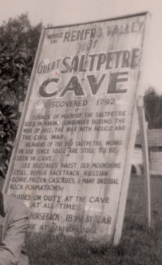 Sixteen miles of such scenery as only the Cumberlands can boast; across clear mountain streams and past cabins nestled in the atmosphere of a John Fox novel, then over the ridge and the visitor is looking down into the narrow valley of Crooked Creek, and on a hillside opposite may be discerned the cool, dark mouth of Saltpetre Cave. It was in 1799 that a pioneer named Baker first entered this cave. After exploring a short distance, he returned to his cabin and brought his wife and three children to share in further exploration. After advancing about 500 yards, Baker dropped his pine torch and it was extinguished. For two days and nights the family wandered through the cave in total darkness, without water or food. Finally Mrs. Baker accidentally leaned against a rock and found it was wet with mud. Concluding rightly that it ought be mud they had brought in on their feet, Baker climbed the rock and there found the light of day. Afterwards, this locality became known throughout the region as the Great Cave, and was valuable as a source of saltpetre during the Indian wars, the War of 1812, the Mexican War and throughout the Civil War. Here the earliest followers of Daniel Boone set up the wooden vats, hoppers, and other apparatus needed in carrying on that most important of early industries-the manufacture of gunpowder. Some say that Boone himself used the cave, for it is known that his companion, Stewart, was killed near the vicinity. And Boone tells in his narrative of how he was forced to live in caves when hiding from Indians. During the War of 1812, when our government could no longer depend upon the importation of gunpowder from foreign sources, it was this cave which supplied much of that valuable necessity. The saltpetre was converted into crystals at the cave and carried out by packhorse expeditions. At first it was taken to Pittsburg to be made into gunpowder, but later the product was manufactured at Lexington, and still later a local mill was established in a locality still known as Powder Mill Holler. Some of the powder from this cave was shipped across the mountains by packhorse, floated down the Mississippi by flatboat and used by the Kentucky Riflemen in the Battle of New Orleans. Even now the remains of the crude vats, hoppers, and wooden pipes of the saltpetre industry may still be seen in the cave, although much of it was used by the natives of the Crooked Creek section a few winters ago as firewood, when the heavy snows prevented their finding fuel elsewhere. Roads were constructed through the cave over which the nitrous earth, taken from various parts of the cave, was hauled to fill the hoppers by ox-cart. Tracks of the broad-tired carts are still on the floor, and on the low parts of the ceiling may still be seen the white marks of oxen horns. But not for its historical significance alone has the Great Saltpetre Cave became one of the greatest attractions in this section of the state. Here are the stalactites and stalagmites, the fanciful rock formations, the grottos and chambers with their romantic or grotesque names-all the beauty which typifies Kentucky's great underground world. There is the Assembly Room, where square dances and religious meetings were held up until about forty years ago. Here we come across Booger Branch, Hogpen, Old Still (the cave often served as a hideout for moonshiners and other lawbreakers of vicinity) and the Russian Dome, where the temperature is always much higher than elsewhere in the cave. In a dark grotto, we may come up on a sunken mound, which the guide tells us is the grave of a slave who was murdered here by his master. A few years ago the cave was a popular rendezvous for the young folks of this and other sections for miles around. Sometimes several families came in wagons and "picnicked" together for three or four days at a time. It became the romantic custom for young couples to bring away a "keepsake" carved from saltpetre, which is of the consistency of soap when first cut out, but hardens when exposed to air. In many an old home in this section today may be found such an article, a heart or book carved from this substance and bearing initials and a long-past date – memento of some old couple's "courtin" days when they visited the cave together. Even in the Law and Order reign of the present day, the story of Great Saltpetre Cave is not without drama. The visitor, riding down into the broken Crooked Creek country, may still sense the shadows of extinct moonshiners lurking in the dark coves of Crooked Creek. Not long ago these hills echoed strangely to the baying of bloodhounds hot on the scent-first demonstration to the hill people of a law other than their own "live by the gun" methods. That demonstration failed, however, and the "Mystery Case" of Crooked Creek-the bush-whack slaying of one Rosco Morris, peaceable country school teacher who was shot while mending a shed near the mouth of Saltpetre Cave-has never been solved. Reprinted in the March 2004 Renfro Valley Bugle Scanning and OCR work done by Andy Niekamp